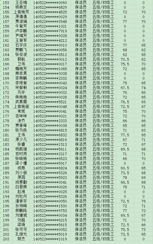 晉城市潔霸清潔服務(wù)股份有限公司職業(yè)技能等級認(rèn)定中心現(xiàn)將2024年8月17日認(rèn)定人員成績公示如下: